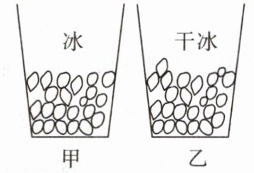 9.(沈阳中考)小组同学做对比实验,如图所示,在甲、乙两个相同杯子中分别放入适量的冰块和干冰块。放置一段时间后,发现杯内物块均变小。甲杯内有液体出现,外壁有小水珠生成;乙杯内仍然是干燥的,外壁有一层薄霜生成。下面分析正确的是(