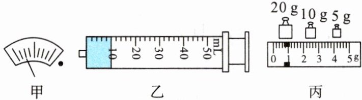 (3) 用注射器继续抽取酒精至 $20 \mathrm{~mL}$ 处, 再将注射器放到天平上, 测得注射器和酒精的总质量如图丙所示为