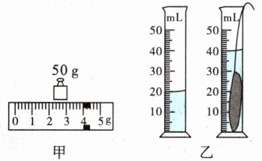 9. (绥化中考)在测量物块密度的实验中, 用调好的天平测量物块的质量, 当天平平衡时, 右盘中砝码的质量和游码的位置如图甲所示, 则物块质量为