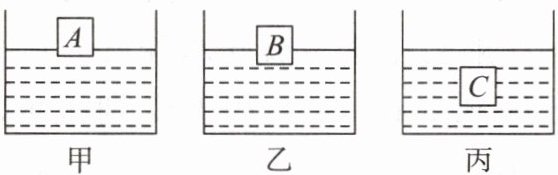 【分析】 三个容器中水的密度相同,正方体排开水的体积关系为$V_{排A}<V_{排B}<V_{排C}$,根据阿基米德原理$F_{浮}=ρ_{液}gV_{排}$可知物体受到的浮力大小关系为$F_{A}<F_{B}<F_{C}$,A错误;由于A和B漂浮,C悬浮,所以根据物体浮沉条件可知它们受到的浮力均等于自身重力,所以有$G_{A}<G_{B}<G_{C}$,又因为三个正方体体积相等,所以根据公式$G=mg=ρgV$可知三个物体的密度大小关系为$ρ_{A}<ρ_{B}<ρ_{C}$,B错误;因为三个容器内水面高度相同,根据液体压强公式可知水对容器底部的压强相等,根据$F=pS$可知容器底部受到水的压力大小相等,C错误;容器对桌面的压力大小等于容器的重力与水对容器底的压力之和,又由$p=\frac {F}{S}$和三个容器完全相同,因此有$p_{甲}=p_{乙}=p_{丙}$,D正确。故选D。