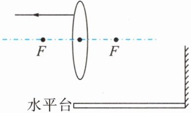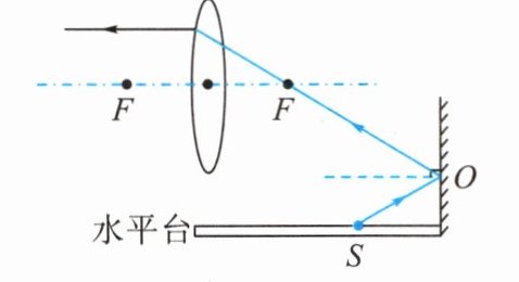 【分析】由于通过右侧焦点的光线经凸透镜折射后,折射光线与主光轴平行,据此可作出凸透镜的入射光线,反向延长该光线交平面镜于点O,则该光线为经平面镜反射后的反射光线;再根据反射角等于入射角,作出入射光线,和水平台的交点即为光源S的位置。