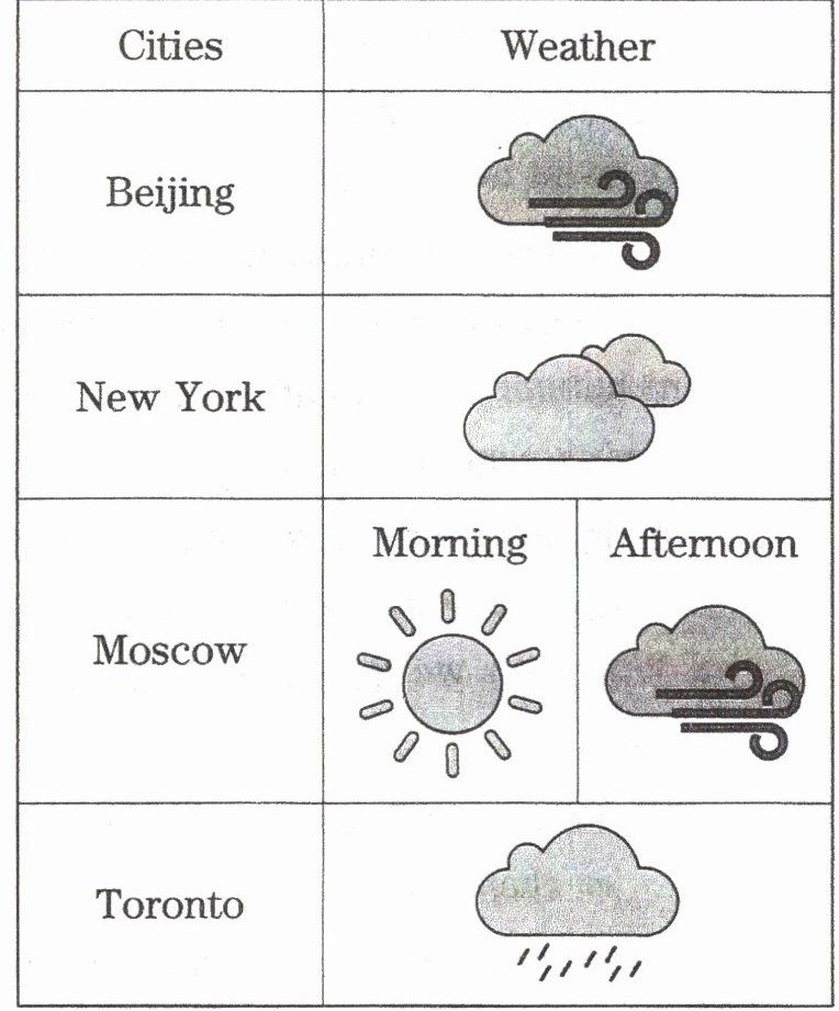 It's windy and cold in Beijing. You'd better stay at home or wear warm clothes when you go out. It's cloudy in New York all the day. In Moscow, the weather is fine and sunny in the morning, but it will be windy in the afternoon. So you need to take warm clothes with you. In Toronto the weather is bad. It's rainy in the morning. Please remember to take an umbrella. The rain will stop in the afternoon, but it will still be cold.
