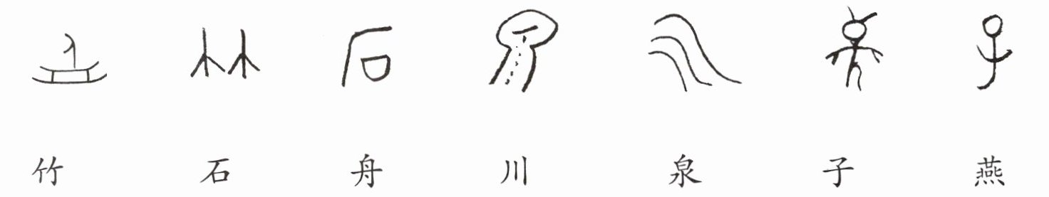 第一个古字(像竹的形状)连“竹”;第二个古字(像林的形状)连“林”;第三个古字(像石的形状)连“石”;第四个古字(像川的形状)连“川”;第五个古字(像泉的形状)连“泉”;第六个古字(像子的形状)连“子”;第七个古字(像燕的形状)连“燕”。