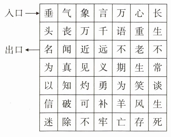 2. 从“入口”开始,将框内汉字用首尾相接的办法组成16个四字词语,最后在“出口”结束。