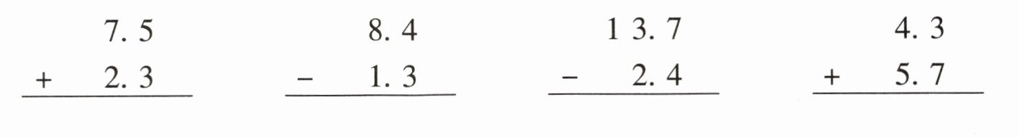 $7.5 + 2.3$,先算$5 + 3 = 8$,再算$7 + 2 = 9$,结果是$9.8$;