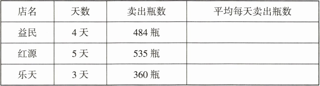 益民店:根据平均数 = 总数÷总天数,可得$484÷4 = 121$(瓶)。