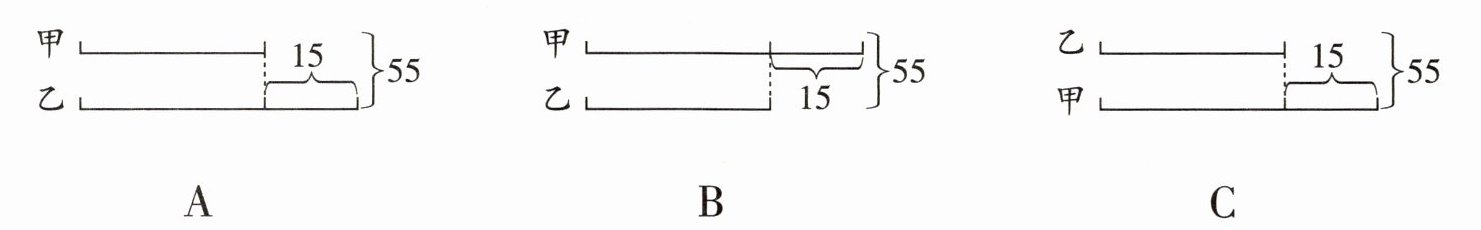 1. 甲与乙的和是55,乙比甲少15,下面的线段图画得不正确的是( )。