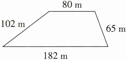 【解析】:梯形的周长等于上底加下底加两条腰的长度。已知梯形上底$80m$,下底$182m$,两条腰分别为$102m$和$65m$,则周长为$80 + 182 + 102 + 65$