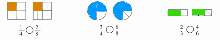 假设一个圆(或其他图形表示整体$1$),把它平均分成$3$份,涂其中$2$份表示$\frac{2}{3}$;把它平均分成$6$份,涂其中$4$份表示$\frac{4}{6}$。