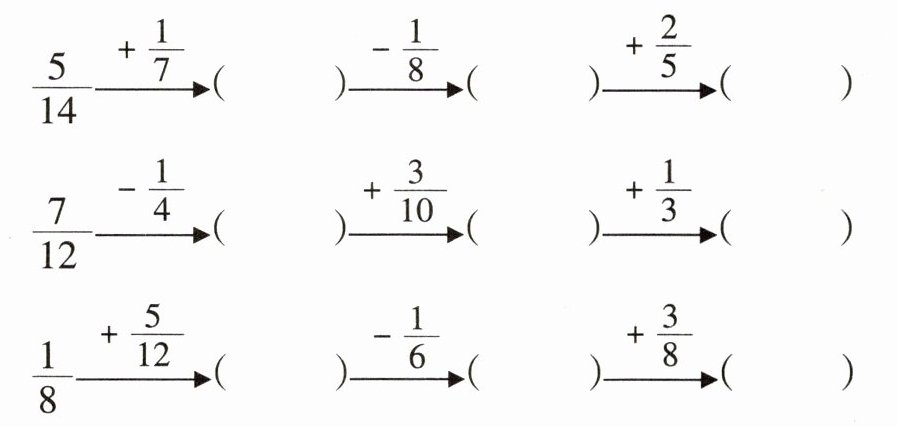 $ \frac { 5 } { 1 4 } \xrightarrow { + \frac { 1 } { 7 } } ( ) \xrightarrow { - \frac { 1 } { 8 } } ( ) \xrightarrow { + \frac { 2 } { 5 } } ( ) $