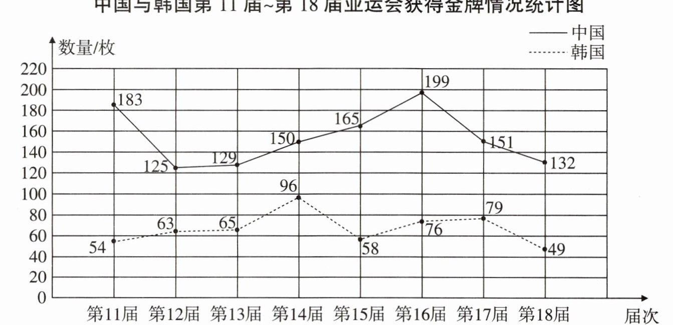 二、下面是中国与韩国第11届~第18届亚运会上获得金牌情况统计图。