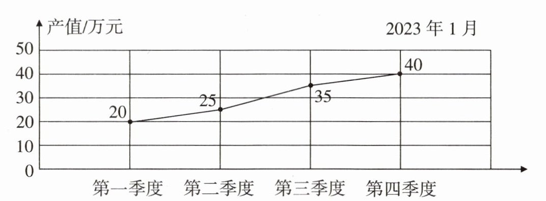 3. 第二季度产值为$25$万元,第一季度产值为$20$万元,升高了$25 - 20 = 5$万元;第三季度产值为$35$万元,第二季度产值为$25$万元,升高了$35 - 25 = 10$万元;第四季度产值为$40$万元,第三季度产值为$35$万元,升高了$40 - 35 = 5$万元。所以第(二)季度到第(三)季度产值升高的幅度最大。
