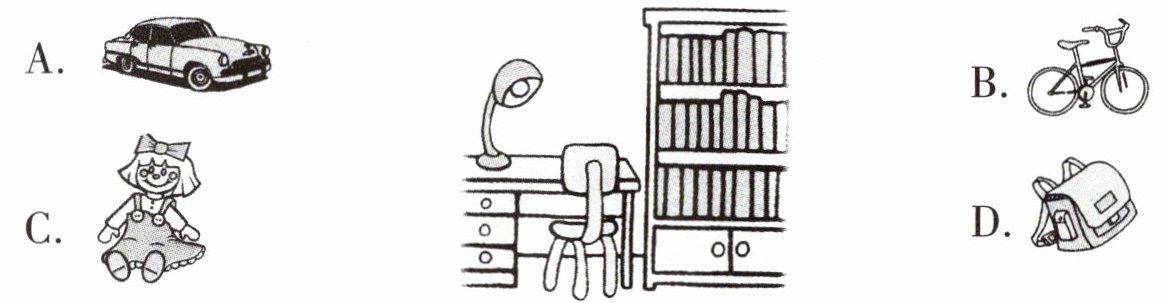 I have many toys in my room. Look! The toy car is on the desk. The toy bike is under the desk. Where is my doll? Oh, it's under the chair. Where's my new schoolbag? Is it in the desk? No, it isn't. Is it on the chair? Oh, yes, I find it!