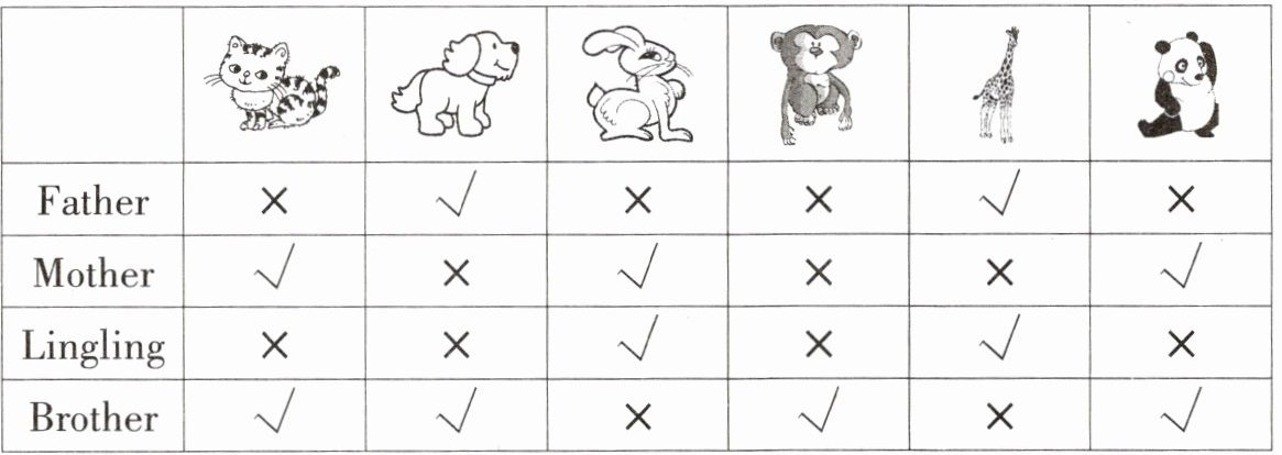 六、根据表格填写玲玲一家人的喜好,“√”表示喜欢,“×”表示不喜欢。