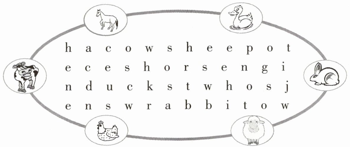 圈出“horse”“duck”“rabbit”“sheep”“hen”“cow”