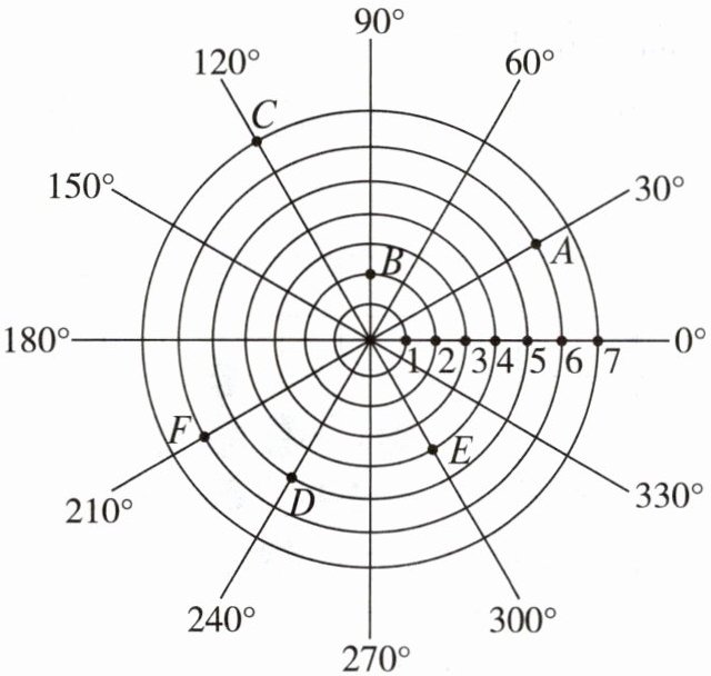 13. 如图,雷达探测器测得六个目标 $ A,B,C,D,E,F $,若目标 $ E,F $ 的位置表示为 $ E(4,300^{\circ}) $,$ F(6,210^{\circ}) $,按照此方法在表示目标 $ A,B,C,D $ 的位置时,其中表示正确的是(