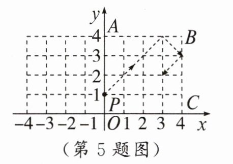 5. 如图,小球从台球桌面 $ ABCO $ 上的点 $ P(0,1) $ 出发,撞击桌边发生反弹(反射角等于入射角),若小球以每秒 $ \sqrt{2} $ 个单位长度的速度沿图中箭头方向运动,则第 $ 50 $ s 的小球所在位置的坐标为 …………………………………………………………………(