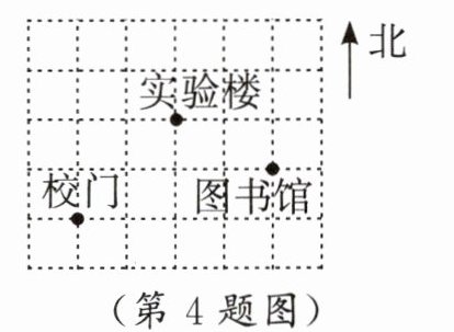 4. 如图,已知校门的坐标是 $ (1,1) $,图书馆的坐标是 $ (5,2) $,那么下列对于实验楼位置的叙述正确的有 ………………………………………………………………………(