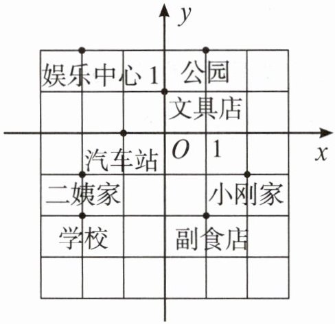 (2) 他路上经过的地方有:副食店、汽车站、二姨家、娱乐中心、公园、文具店。
