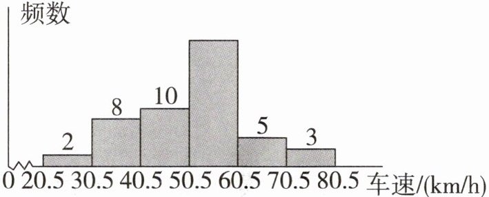 7. 某中学的课外兴趣小组对校园附近的某段路上机动车的车速作了一次调查,图中反映他们某天在某一段时间内,监测的若干辆车的车速(车速取整数,单位:km/h)情况. 如果车速大于40km/h且不超过60km/h为正常行驶. 统计资料表明正常行驶车辆的百分比为85%. 那么,这天在这段时间中他们监测的车有