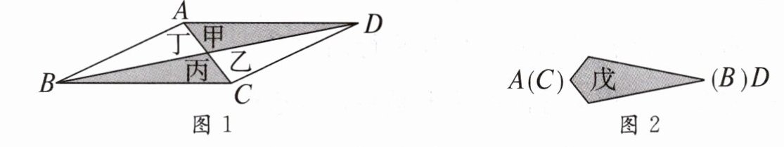 6. 如图1,平行四边形纸片$ABCD$的面积为$120$,$AD=20$.今沿两对角线将四边形$ABCD$剪成甲、乙、丙、丁四个三角形纸片.若将甲、丙合并($AD$,$CB$重合)形成一个对称图形戊,如图2所示.则图形戊中的四边形两对角线长度和为 …………………………………(