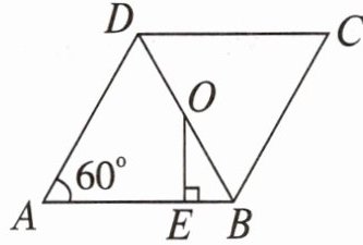 14. 如图,在菱形 ABCD 中,$ \angle A = 60^\circ $,$ AB = 4 $,O 为对角线 BD 的中点,过点 O 作 $ OE \perp AB $,垂足为 E。