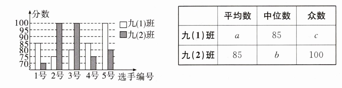 10. 某中学开展“社会主义核心价值观”演讲比赛活动,九(1)班、九(2)班根据初赛成绩各选出5名选手参加复赛,两个班各选出的5名选手的复赛成绩(满分100分)如图.根据图中数据解决下列问题: