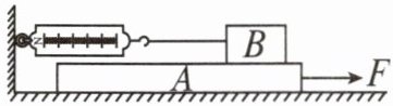 7. 如图所示,小明用 10 N 的水平拉力 $ F $ 拉动木板 $ A $ 在水平地面上向右运动,物块 $ B $ 相对地面静止不动,此时弹簧测力计的示数为 6 N,下列说法正确的是 ……(