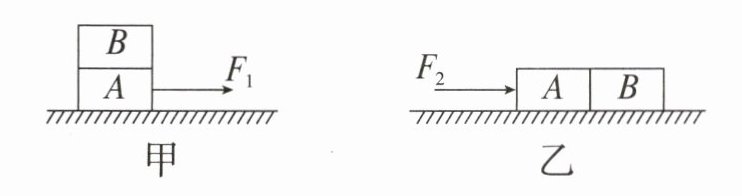 6. 如图甲所示,完全相同的木块 $ A $ 和 $ B $ 叠放在水平桌面上,在 10 N 水平拉力 $ F_1 $ 的作用下,木块 $ A $、$ B $ 一起做匀速直线运动。如图乙所示,将木块 $ A $、$ B $ 紧靠着放在同一水平桌面上,用水平力 $ F_2 $ 推木块 $ A $,使它们一起做匀速直线运动。甲、乙两种情况中,木块 $ A $ 受到的摩擦力分别是 ……(