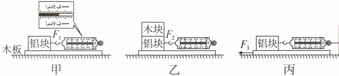 (选填“受”或“不受”)摩擦力的作用。(4) 利用图丙装置进行实验时,通过向左水平拉动木板来测铝块受到的滑动摩擦力,当拉力 $ F_3 $ 增大时,铝块受到的摩擦力大小