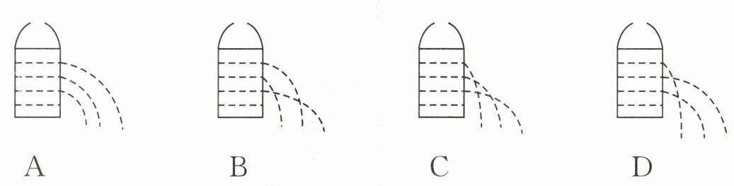 4. 小明在一个塑料瓶的侧壁上戳了三个洞用来探究水的压强。他在实验报告中画出了如图所示的四种水流喷出时的图示,其中正确的是 ………………………………………(