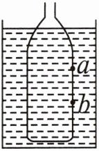 12. 现有一个塑料瓶,其侧壁有$a$、$b$两个小孔并用塞子塞住,塑料瓶内盛有一定质量的酒精,如图所示,把塑料瓶放入水中,当塑料瓶内的液面与外面水的液面相平时,拔出$a$、$b$两个小孔上的塞子,则 ……………………………………………………………(