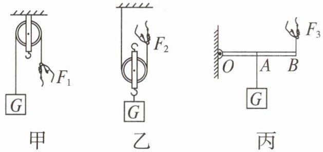 10. 如图所示,用甲、乙、丙三种简单机械分别提起同一重物G,已知滑轮重20N,杠杆(OB=2OA)重10N,手的拉力始终沿竖直方向,忽略绳重及摩擦,下列说法错误的是 ………………………………………………………………………………… (
