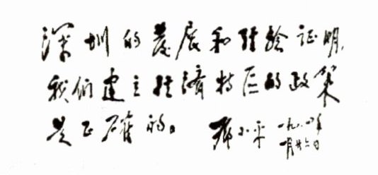 邓小平为深圳经济特区题词:“深圳的发展和经验证明,我们建立经济特区的政策是正确的。”