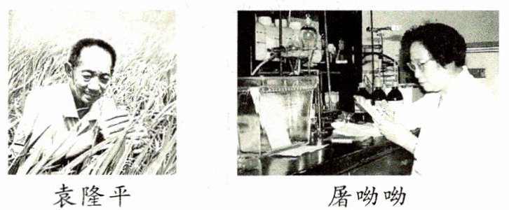 袁隆平培育成功籼型杂交水稻,大幅度提高了粮食产量和质量,被誉为“杂交水稻之父”。屠呦呦领导的科研团队发现了能够抵抗疟疾的青蒿素,获得 2015 年诺贝尔生理学或医学奖。