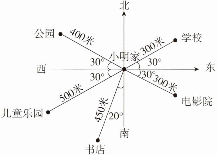 下图是小明站在自己家观测到几个建筑物的平面图。以小明家为观测点: