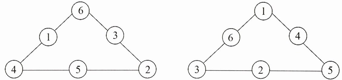 画一个三角形,在它的三个顶点和三边的中点各画一个小圆圈。然后把1,2,3,4,5,6分别填写到这6个小圆圈里,使三角形每条边上3个数的和都相等。