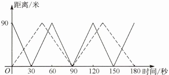 2. 一游泳池长$90$米,甲、乙二人分别在游泳池相对两边同时朝另一边游,甲的速度是$3$米/秒,乙的速度是$2$米/秒,图中的实线和虚线分别为甲、乙与游泳池一边的距离随游泳时间的变化而变化的图象. 若不计转向时间,则从开始起到$3$分钟止,他们相遇