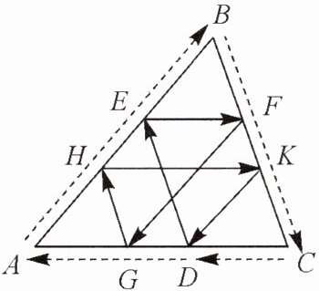 1. 如图是一个三角形林场,其中的线段均为道路,内部的每条线段分别与三角形的某条边平行. 林场的两名检查工人从$D$处同时出发,甲沿着$DABCD$走一圈,检查林场外部;乙沿着$DEFGHKD$走一圈,检查林场内部. 如果两人用同样的速度行走,那么谁先回到出发点$D$处呢?