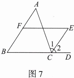 8. 如图7,已知$CE$平分$∠ACD$,且$∠ACD=2∠B$,判断$AB$与$EC$是否平行,并说明理由.