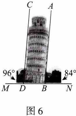 7. 如图6,比萨斜塔是世界著名的建筑奇观和旅游胜地之一. 由于地基不牢固,塔身已经倾斜,测得$∠MDC=96^{\circ }$,$∠ABN=84^{\circ }$,直线$AB$与$CD$会相交吗?说明理由.