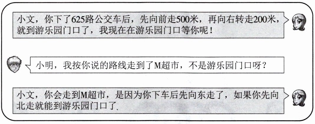 【解析】:已知小文先向东走$500$米,再向右转(即向南)走$200$米到$M$超市,而正确路线是先向北走$500$米,再向右转(即向东)走$200$米到游乐园门口。所以从$M$超市出发,先向北走$200$米,再向左转(即向西)走$500$米,然后再向左转(即向北)走$500$米,最后向右转(即向东)走$200$米就到游乐园门口。