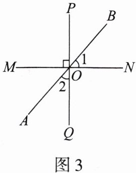 4. 如图3,直线$PQ⊥MN$,垂足为点$O$,$AB$是过点$O$的直线. 若$∠1 = 50^{\circ}$,则$∠2$的度数为(