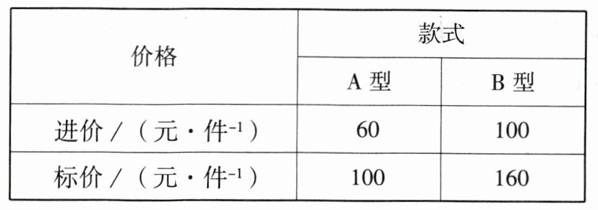 5. 某服装店用6000元购进A、B两种款式的服装,按标价出售后可获毛利润3800元(毛利润=售价-进价). 这两种服装的进价、标价分别如下表所示: