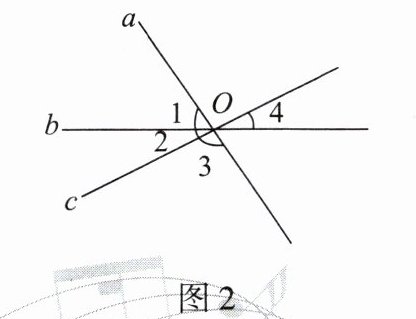 3. 如图2,已知直线$a$,$b$,$c$相交于点$O$,若$∠1 = 2∠2$,$∠3 - ∠1 = 30^{\circ}$,则有下列结论:①$∠1$,$∠2$,$∠3$互为邻补角;②直线$a⊥c$;③$∠4 = 30^{\circ}$.