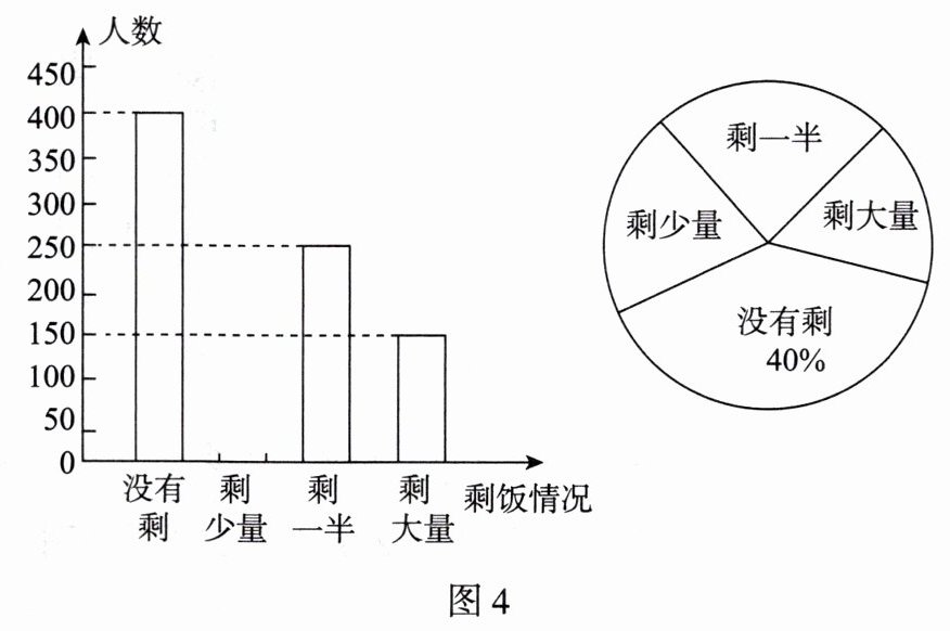 4. 某高校学生会发现同学们就餐时剩余饭菜较多,浪费严重,于是准备在校内倡导“光盘行动”,让同学们珍惜粮食. 为了让同学们理解这次活动的重要性,校学生会在某天午餐后,随机调查了部分同学这餐饭菜的剩余情况,并将结果统计后绘制成图4所示的不完整的统计图.