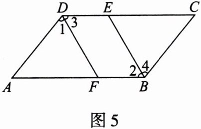因为$BE$,$DF$分别平分$∠ABC$,$∠CDA$,所以$∠2 = ∠4 = \frac{1}{2}∠ABC$,$∠1 = ∠3 = \frac{1}{2}∠CDA$.