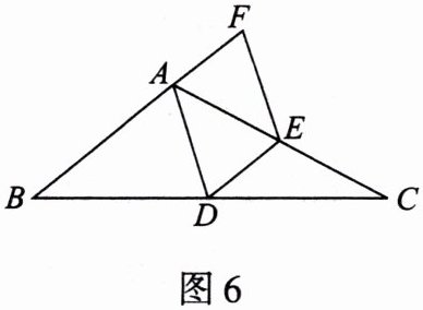 8. 如图 6,在 $\triangle ABC$ 中,$D$,$E$ 分别是边 $BC$,$AC$ 的中点,连接 $DE$,$AD$,点 $F$ 在 $BA$ 的延长线上,且 $AF=\frac{1}{2}AB$,连接 $EF$,判断四边形 $ADEF$ 的形状,并加以证明.
