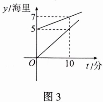 6. 某边防部队接到情报,近海有一可疑船只A正向公海方向行驶,边防部队迅速派出快艇B追赶,A,B分别相对于海岸的距离y(海里)与追赶时间为t(分)之间的函数关系图象如图3所示,则追赶15分后A,B相距