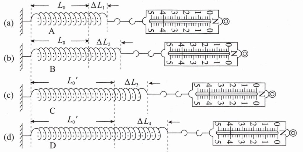 19. 为了研究受到拉力时弹簧长度的增加量与弹簧自身因素的关系,小华同学选用弹簧A、B、C、D和测力计进行实验。已知弹簧A、C由同种金属丝绕制而成,弹簧B、D由另一种金属丝绕制而成,A、B原来的长度均为L0,C、D原来的长度均为L0',且A、B、C、D的横截面均相同。他将弹簧A、B、C、D的左端固定,并分别用水平向右的力通过测力计拉伸弹簧,它们的长度各自增加了ΔL1、ΔL2、ΔL3、ΔL4,如图(a)(b)(c)(d)所示。请仔细观察实验现象,归纳得出初步结论。